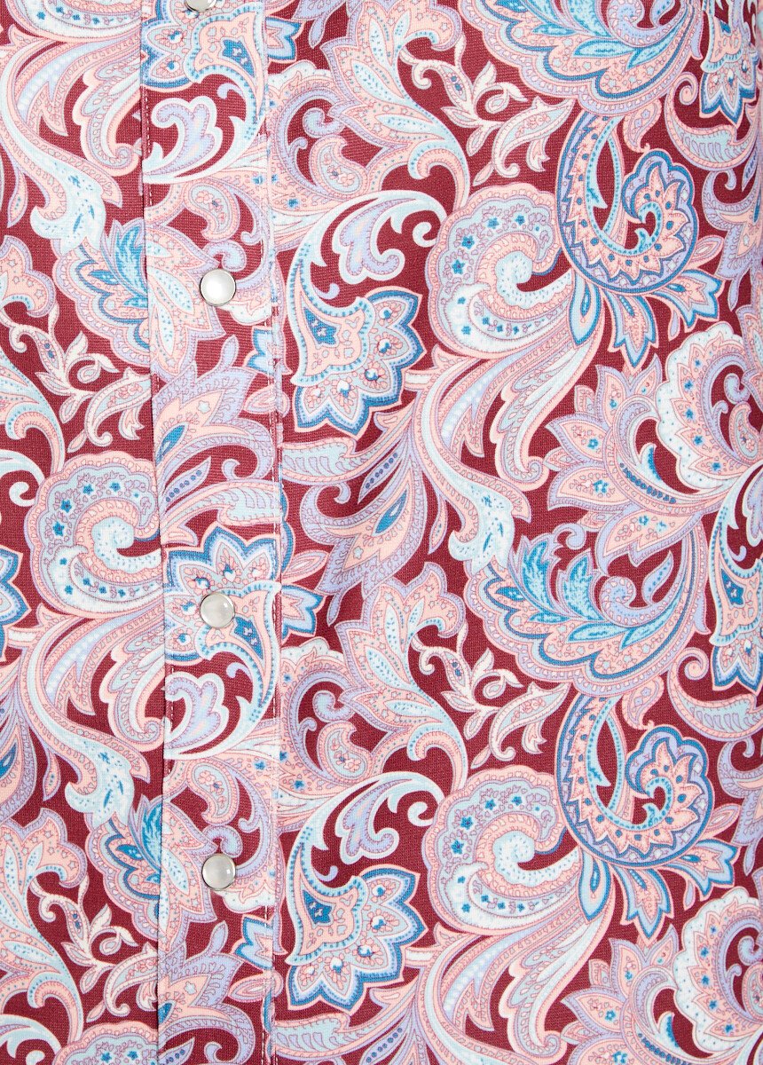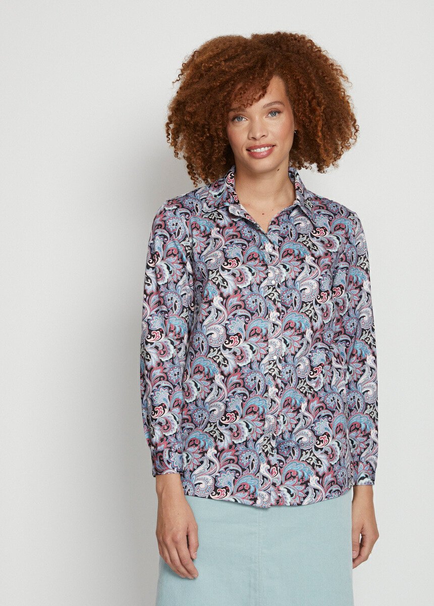 An accessory to your seasonal looks, the blouse features a modern and refined print. Pointed collar on collar stand. Tab closed with fancy snaps. Long sleeves, snap bracelets. Straight base with split sides. Topstitched finishes.