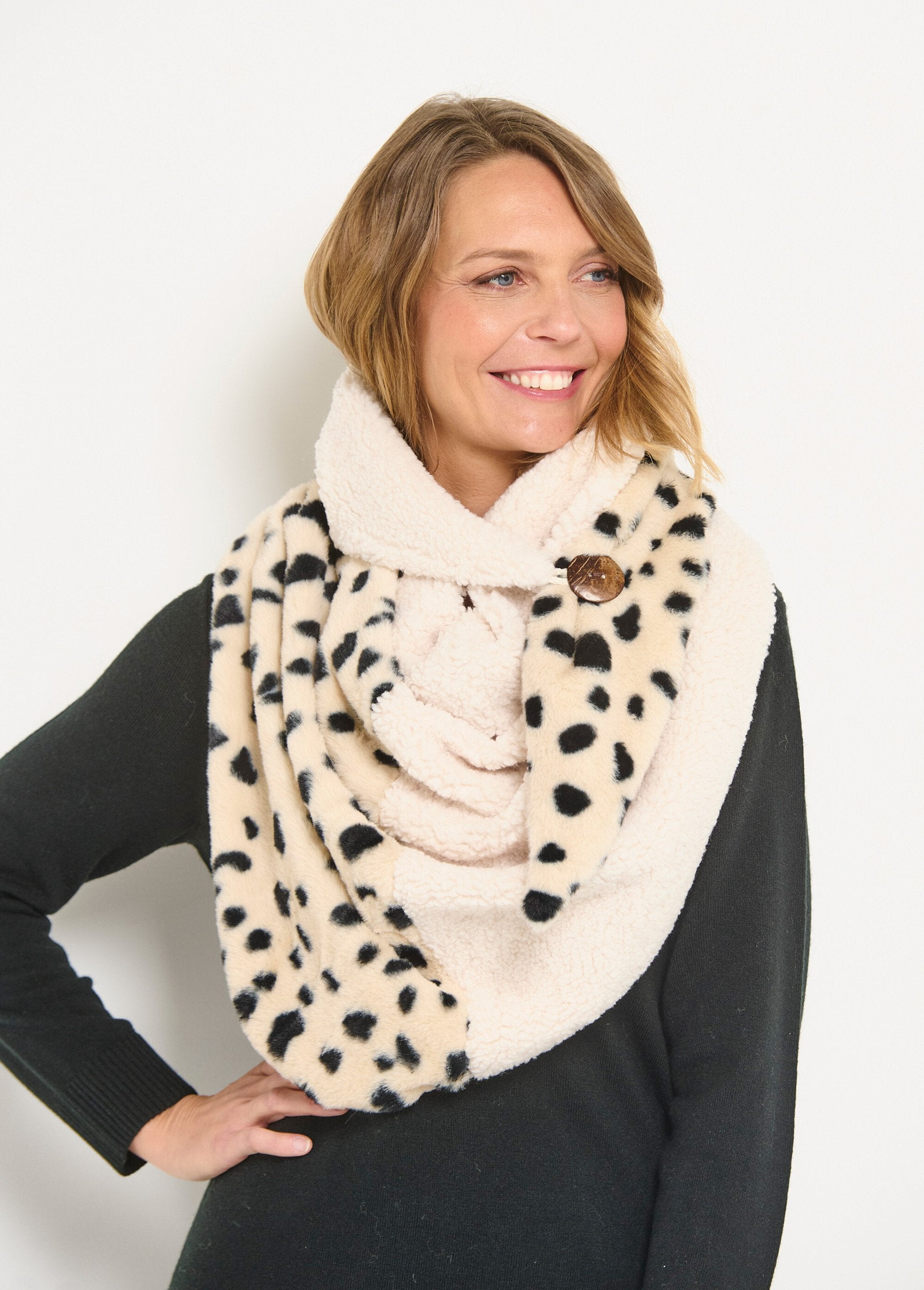 This shrug is a stylish and warm piece, combining soft fleece with faux Dalmatian fur for a very "wow" effect! The reverse is made of matching fleece knit, offering an extra touch of softness. It closes with a pretty wooden button. Perfect for warming up your outfits in style, this shrug is ideal for cool autumn evenings or as a chic accessory for special occasions.