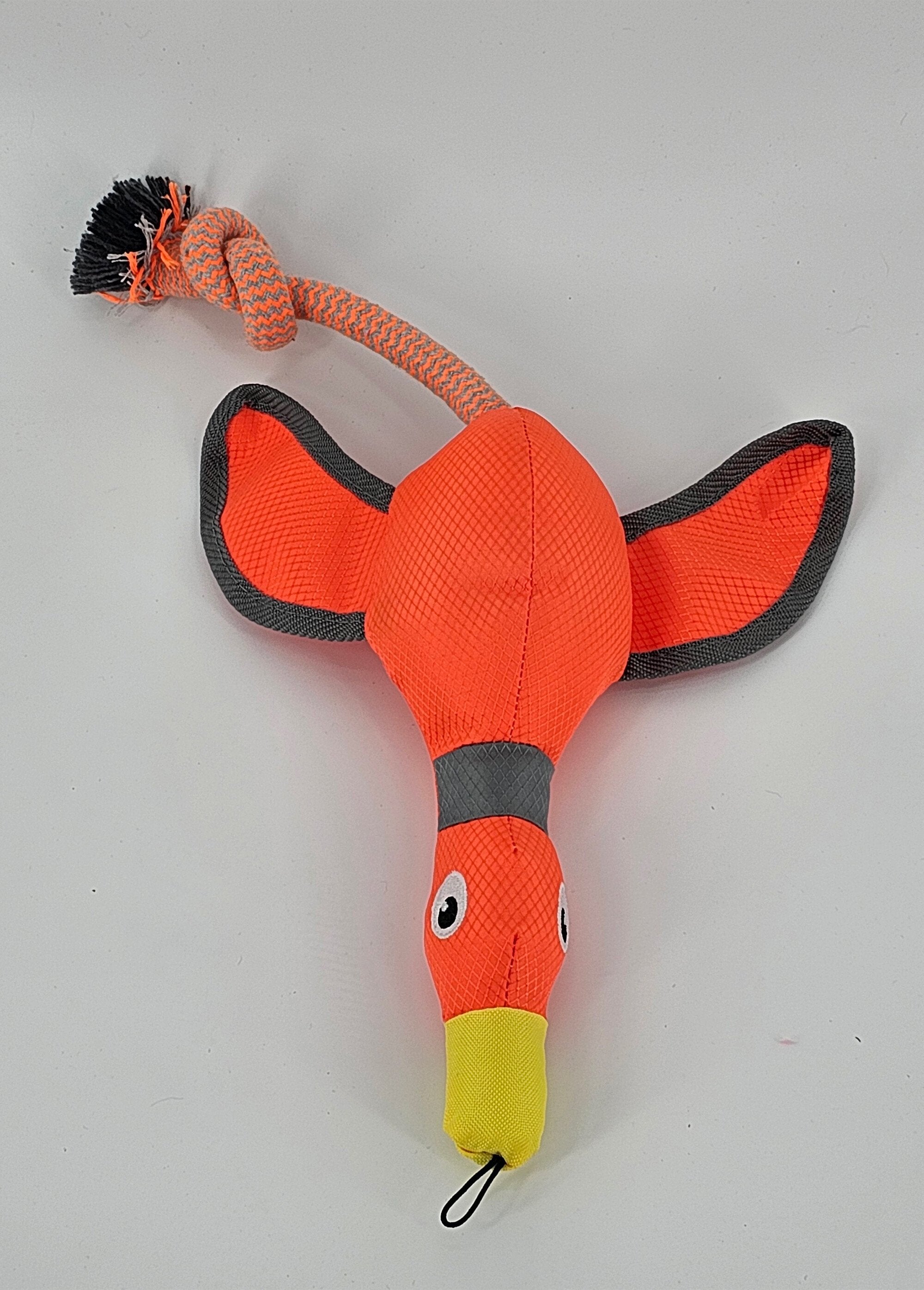 This 48cm duck plush toy with integrated rope is the perfect toy for your dog. Its bright orange colour attracts attention, while its design helps satisfy the need to chew without damaging teeth. The plush toy absorbs your scent, reassuring your pet when you are away. Designed for indoor and outdoor use, it is easy to carry around your companion's living space. Made from a durable material, this plush toy ensures hours of play and comfort for your dog, while being durable and practical.