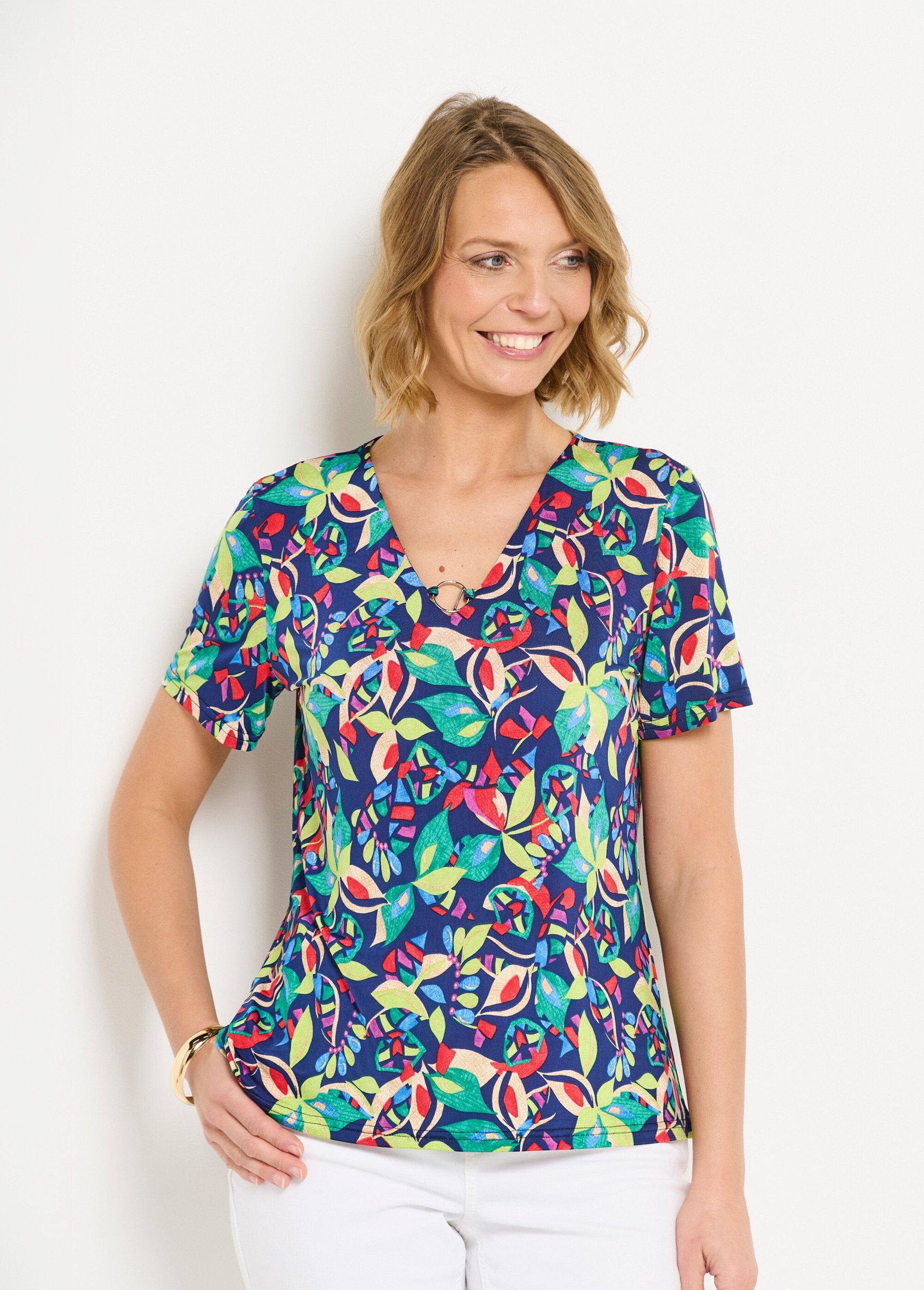 The plain or printed T-shirt, made in a soft and stretchy knit. Inner collar at the front V-neck, drop with fancy charm. Bias bias at the back neckline. Short sleeves. Straight base. French made.