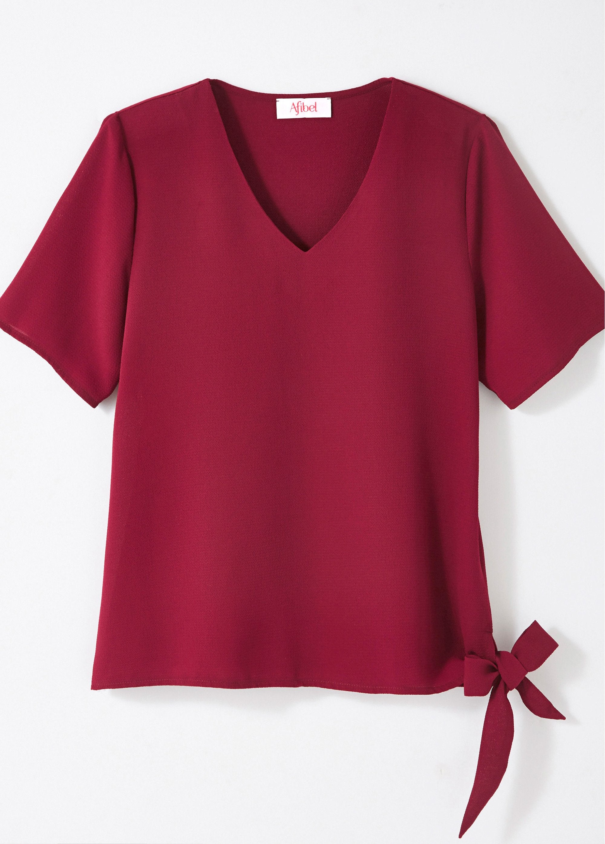Plain or printed, a tunic with an original, feminine line. V-neckline emphasized by a back-stitched bias and a front welt. Straight base extended with side ties for a beautiful blousant effect. Double-stitched finish at bottom of short sleeves.